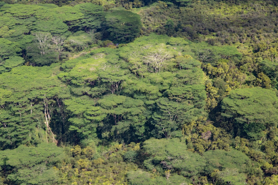 This ridge glows crimson at midday as sunlight bounces off its iron-rich soil. The juxtaposition of red rock and neon-green fern lines makes for otherworldly aerial abstracts.