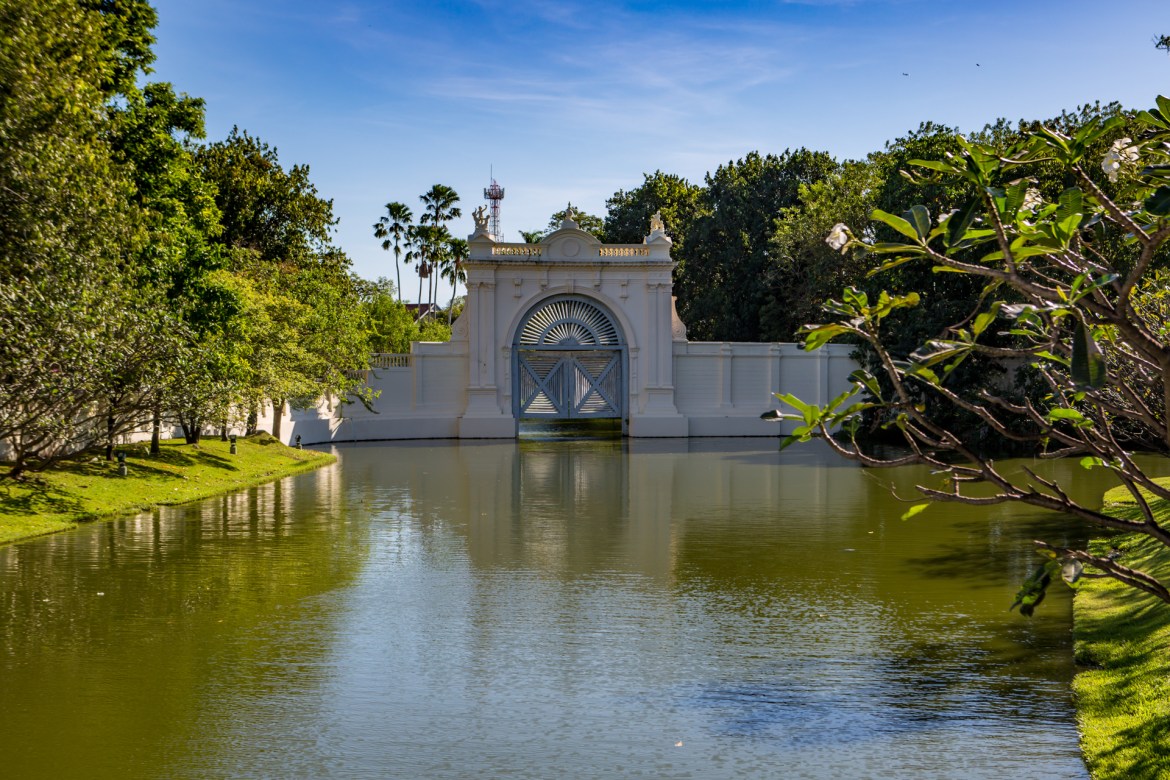 Aisawan Thiphya-Art — A Pavilion That Paints with Water. Floating at the heart of the main pond, this Thai pavilion is Bang Pa-In’s signature. Arrive early for mirror-calm reflections, then edge around the pond to align the structure with trimmed hedges and white colonnades beyond. Midday glare can be harsh; use the pavilion’s shadows for contrast and try a low angle near lotus clusters. Late morning, wind often adds texture to the water—swap symmetry for ripple abstracts.