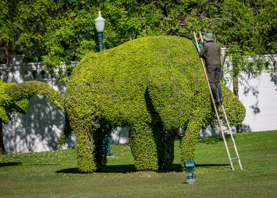 Long lens through topiary gaps to compress pavilion + bridge layers.
