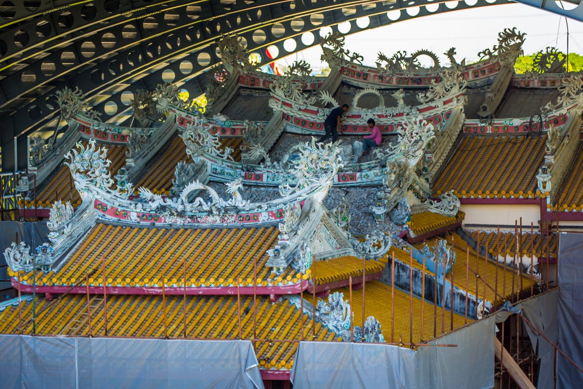 Wehart Chamrun — Red Lacquer & Dragon Dreams. This Chinese-style throne hall steals your attention with saturated reds and heavy ebony. Inside (when open), hunt for layered patterns and ceremonial objects; outside, pull back to frame the hall with palms and pale balustrades for color contrast. It’s the complex’s most overt nod to Sino-Thai ties—and an interior treat on hot days.