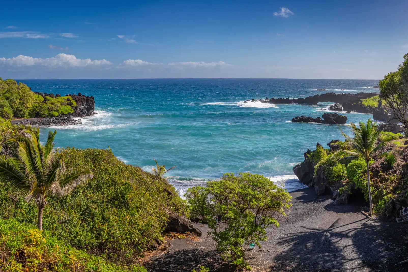 A pocket of jet-black shore wrapped in neon-green naupaka and sea arches, Waiʻānapanapa turns the Road to Hāna into a color-theory masterclass. A polarizer tames midday glare while tide lines and basalt boulders give you instant foregrounds. Capacity is controlled, so non-resident reservations are mandatory—snag the earliest or latest slot for softer light and less bustle. Pair your beach time with the coastal trail for changing angles on blowholes and coves. Best time/shot: golden hours for nuanced texture on lava; signature viewpoint: the overlook above Pailoa (Black Sand) Beach.