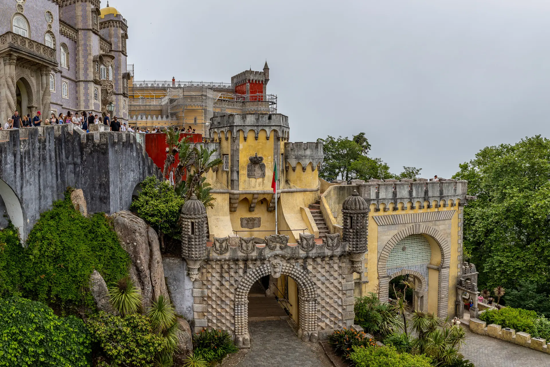 Think of Pena Palace as a four-act play: you enter through the intro courtyard where color and crenellations set the mood, glide into highlight halls that stitch monastery calm to Romantic flourish, step onto wind-brushed terraces and garden paths where fog and light do their dance, and finish at a high vantage where Sintra rolls away like painted scenery. Keep your camera ready for quick pivots—the weather changes costumes often. Work outside-in and back out again: when interiors bottleneck, slip to the arcades for fresh angles, then rejoin the one-way route. Save five quiet minutes near the end to simply stand and watch the palette shift; it’s the moment that anchors the whole visit.