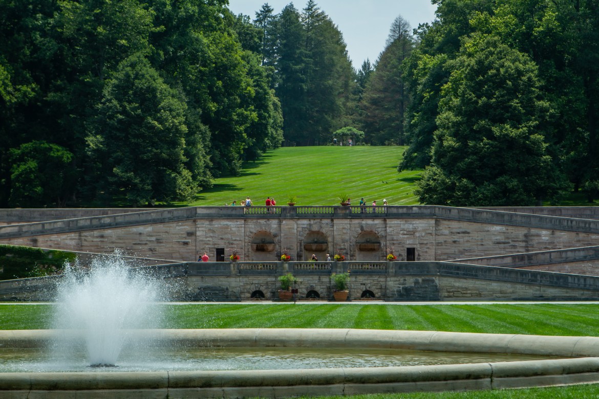 Walk out to the South Terrace and the estate exhales into Blue Ridge horizons—terraced stone, clipped lawns, and a sweep of view that feels tailor-made for golden hour. This is your reset between interiors and gardens, a place to let light and landscape do the talking. Lean against the balustrade, trace the hill lines, and notice how the mansion’s silhouette anchors the panorama without overpowering it. From here, drift toward the Italian Garden or down to the Lagoon, carrying that terrace calm with you as the day opens back up.